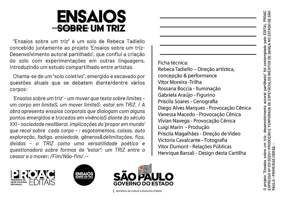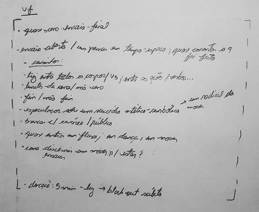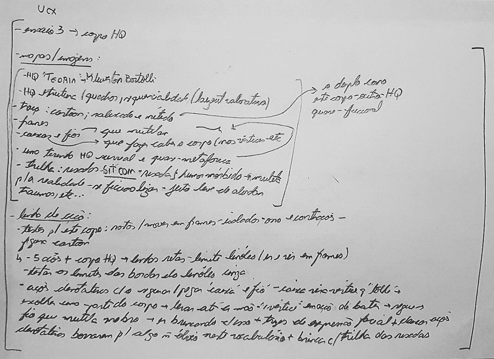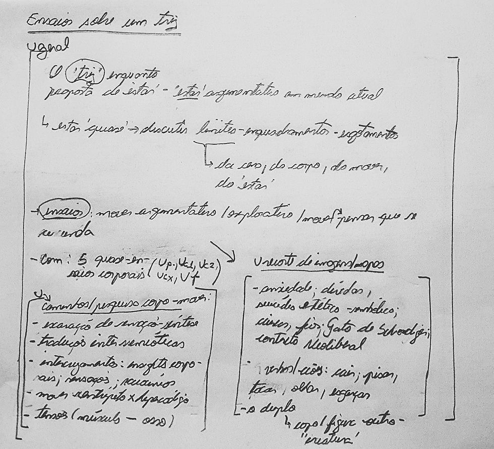 Compartilho, aqui, a ferramenta que venho chamando de 'UNIVERSOS' (Us) dentro de uma concepção dramatúrgica/coreográfica diante das minhas pesquisas.// O "Ensaios sobre um triz" também foi sendo desenvolvido com essa forma de anotação, que foi se atualizando conforme o solo ia ganhando contornos e des-contornos.// Os Us são uma forma de eu organizar meu pensamento enquanto proposta movente na dança - forma esta que segue sendo testada.// Abaixo tem algumas anotações diretas do meu caderno que contém os Us atualizados sobre o solo - Eles datam, enquanto concepção, de dezembro de 2021 & Seguem para futuras revisitações...